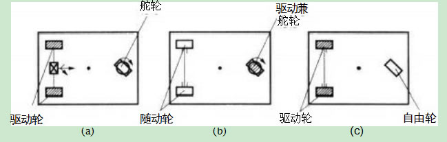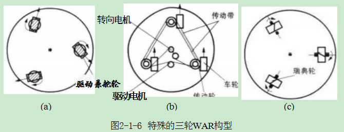 輪配置中也有一些很少見的配置方式,如圖2-1-6所示,圖2-1-6(a) 中 三 個(gè) 輪互成120°。車輪不僅可d立驅(qū)動而且可以d立轉(zhuǎn)向;圖2-1-6(b) 三個(gè)車輪采用 同步驅(qū)動系統(tǒng)控制,三個(gè)車輪同時(shí)用來驅(qū)動與轉(zhuǎn)向,這種機(jī)器人一個(gè)突出的特點(diǎn)是機(jī)器人本體相對于地面的姿態(tài)保持不變;圖2-1-6(c) 互成120°布置的三個(gè)車輪采用瑞典輪,通過d立驅(qū)動各輪可實(shí)現(xiàn)機(jī)器人全方位移動。
