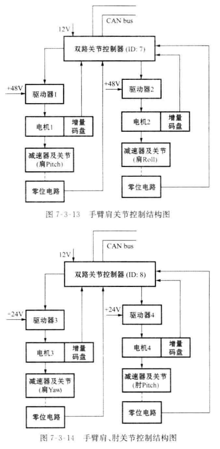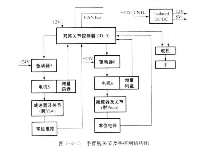 手臂各關(guān)節(jié)控制電路采用分布式控制系統(tǒng),各關(guān)節(jié)控制器(主 MCU 是 TMS320LF2407)由CAN 總線相連(CAN2.0-A 版本)。控制周期為5m (即上位機 與 所 有 關(guān) 節(jié) 控 制 器 通 信 一 遍 , 再 加 一 定 裕 度 后 的 時 間 ) 。 各 關(guān) 節(jié) 控 制 電 路 結(jié) 構(gòu) 如