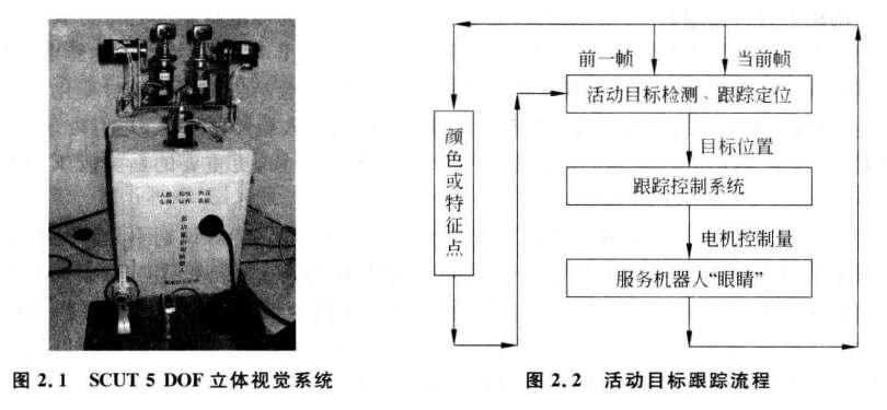圖2.1所示的服務(wù)機(jī)器人“眼睛”是一個(gè)5 DOF 立體視覺(jué)系統(tǒng),它能夠跟蹤和識(shí)別活 動(dòng)的目標(biāo)。它是由 SCUT “智能計(jì)算機(jī)”科研團(tuán)隊(duì)研制成功的。該“眼睛”包括兩個(gè)彩色 攝像機(jī)、圖像處理板、個(gè)人電腦、數(shù)據(jù)采集卡、5個(gè)直流電機(jī)、直流電機(jī)驅(qū)動(dòng)器?紤]到主 動(dòng)跟蹤和目標(biāo)特征與速度和魯棒性等要求,該“眼睛”以基于顏色的跟蹤算法為基礎(chǔ),結(jié) 合目標(biāo)特征跟蹤及目標(biāo)運(yùn)動(dòng)預(yù)測(cè)等就可以對(duì)活動(dòng)目標(biāo)進(jìn)行跟蹤和識(shí)別。