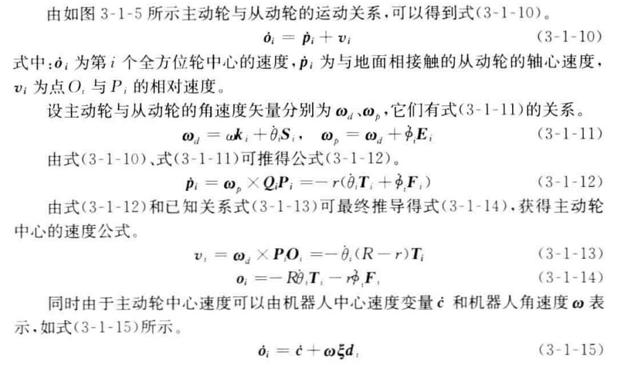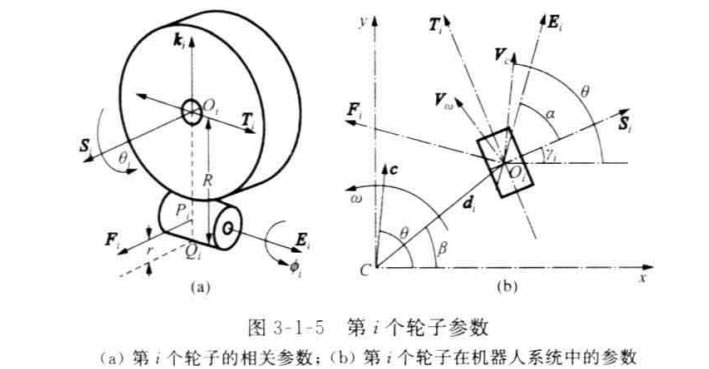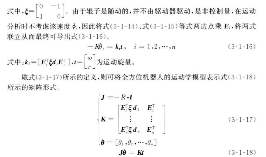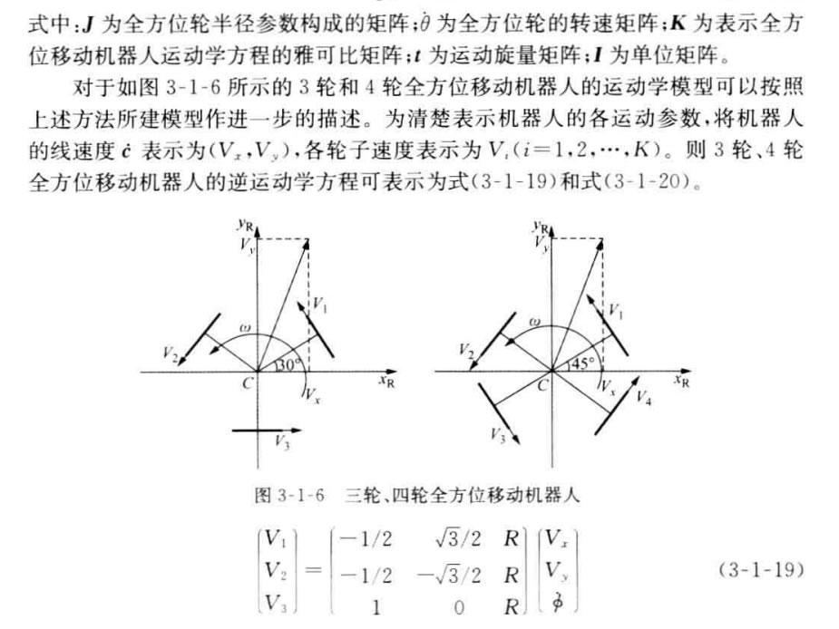 具有傳統(tǒng)車輪的機器人只能有兩個自由度的運動,所以在運動學上,它等價于 傳統(tǒng)的陸上車輛。然而,具有全方位輪的機器人有3個自由度運動的能力,即沿著 平面上x 軸、y 軸以及繞自身中心旋轉(zhuǎn)的運動能力,這充分增加了機器人的機動 性。本節(jié)將給出這種全方位移動機器人的運動學模型。