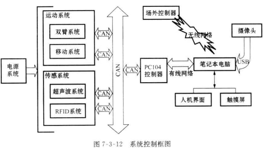 展廳機(jī)器人系統(tǒng)各硬件模塊主要由CAN 總線連接,通過(guò)統(tǒng)一的CAN總線協(xié)議將各模塊簡(jiǎn)單地加載到系統(tǒng)中。系統(tǒng)主要由電源系統(tǒng)、運(yùn)動(dòng)控制系統(tǒng)、傳感系統(tǒng)等組成,其中運(yùn)動(dòng)控制系統(tǒng)包括雙臂系統(tǒng)及移動(dòng)系統(tǒng),傳感器系統(tǒng)包括超聲波系統(tǒng)、RFID定位系統(tǒng)、視覺(jué)系統(tǒng)組成。具體結(jié)構(gòu)由圖7-3-12所示。