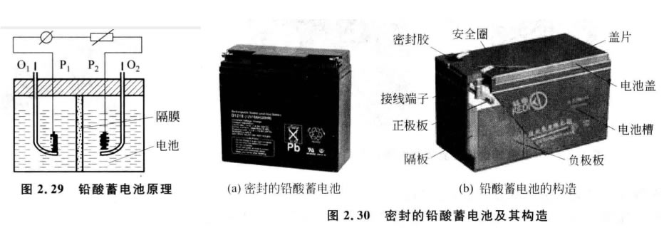 1859年,法國(guó)人普蘭特發(fā)明了鉛酸蓄電池,至今已有 150多年的發(fā)展歷程。鉛酸蓄電池在理論研究、產(chǎn)品種類 及品種、產(chǎn)品電氣性能等方面都得到了長(zhǎng)足的進(jìn)步,在交 通、通信、電力、軍事、航海、航空等各個(gè)領(lǐng)域,鉛酸蓄電池都 起到了不可缺少的重要作用。鉛酸蓄電池的原理和構(gòu)造如 圖2.29和圖2.30所示,它是一種電極由鉛及其氧化物制成,電解液是硫酸溶液的蓄電池。鉛酸蓄電池在荷電狀態(tài)下,正極的主要成分是二氧化 鉛,負(fù)極主要成分為鉛。在放電狀態(tài)下,正負(fù)極的主要成分均為硫酸鉛。