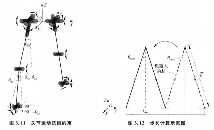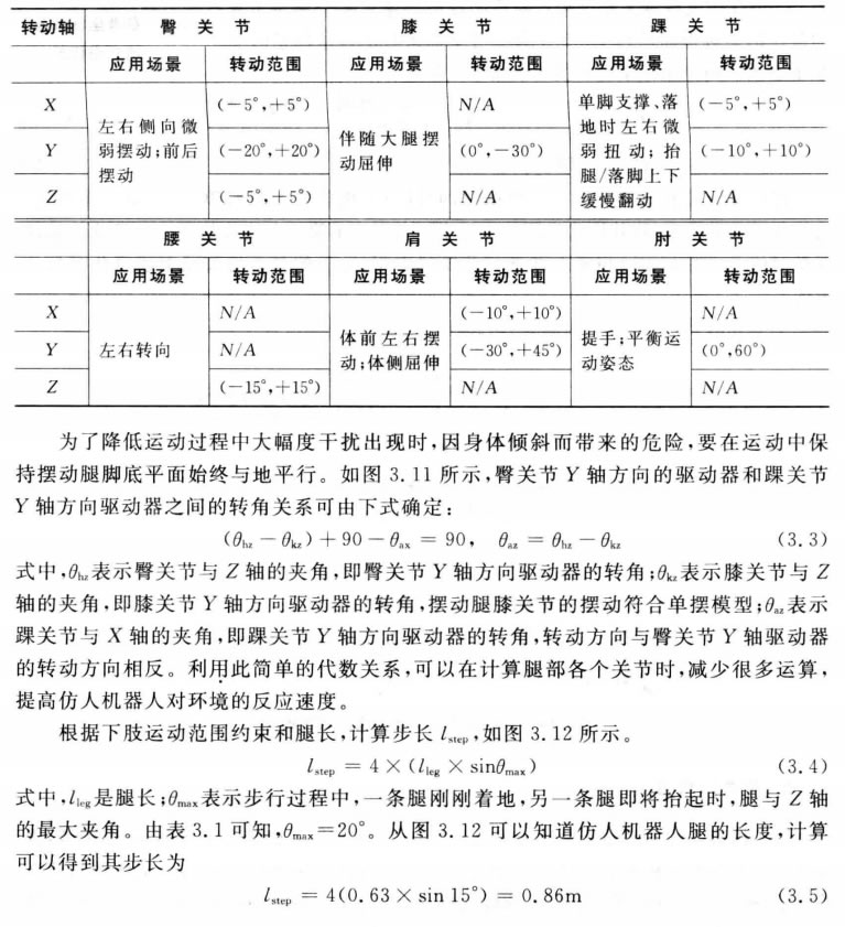 (1)運(yùn)動范圍約束。智能接待智能接待機(jī)器人各個關(guān)節(jié)都有其運(yùn)動范圍,需要對各個關(guān)節(jié)的運(yùn)動 范圍進(jìn)行約束。為了使其能夠更穩(wěn)定地步行,要分別對智能接待智能接待機(jī)器人下肢12 DOF 的運(yùn)動 和上體腰及手臂等7個關(guān)節(jié)的運(yùn)動進(jìn)行約束。全身各個關(guān)節(jié)的運(yùn)動范圍分別如表3.1 所示,由于兩條腿的運(yùn)動范圍一樣,所以表3.1中沒有區(qū)分左右腿,只是按照關(guān)節(jié)來描 述。運(yùn)動幅度正負(fù)的標(biāo)定是以直立姿態(tài)為標(biāo)準(zhǔn),根據(jù)關(guān)節(jié)轉(zhuǎn)動方向來定,順時針方向?yàn)?負(fù),逆時針方向?yàn)檎?