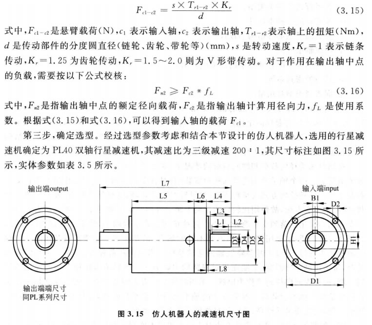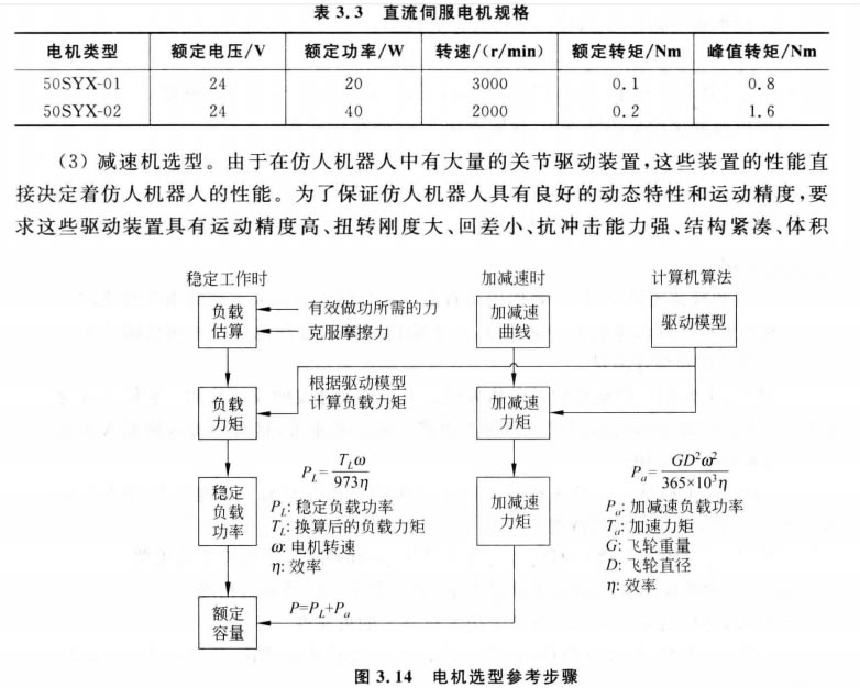 電機(jī)是將電能轉(zhuǎn)化為機(jī)械能的部件,由此發(fā)生的力經(jīng)過以減速器為核心的動(dòng)力傳遞 系統(tǒng)到達(dá)負(fù)載端。在此過程中, 一部分力克服摩擦,以熱能的形式耗散出去,因此傳動(dòng)效 率無法達(dá)到100%。在實(shí)際設(shè)計(jì)中,應(yīng)該將上述路線的順序倒過來,即以負(fù)載的大小和摩 擦系數(shù)及運(yùn)動(dòng)效率去推算電機(jī)的容量。施加于電機(jī)的負(fù)載大致可以劃分成三種基本類 型:有效力、無效力、慣性力。智能交互機(jī)器人的驅(qū)動(dòng)器大致有直流電機(jī)、步進(jìn)電機(jī)、舵機(jī)。如 圖3.14所示為電機(jī)選擇的方法和步驟。從圖中可知,決定電機(jī)容量時(shí),涉及負(fù)載估算、 驅(qū)動(dòng)對(duì)象運(yùn)動(dòng)規(guī)律確定、傳動(dòng)系統(tǒng)轉(zhuǎn)動(dòng)慣量折算等內(nèi)容[96]。