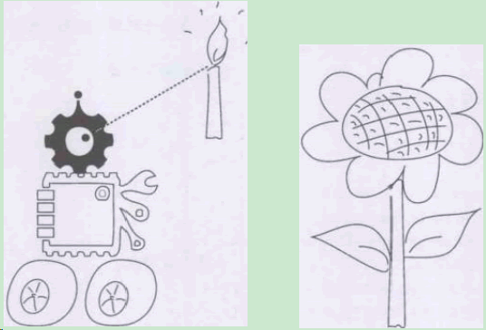 解決了風扇的問題,再來看看如何利用復眼傳感器找到火源。這個問題可以說是到 目前為止面對的Z富挑戰(zhàn)性的問題了,機器人需要在滅火的場地內(nèi)以合理的方式探索尋 找火源的所在,并且運動到火源近前,它涉及機器人的滅火策略、路徑規(guī)劃、運動控制等多 方面的問題。 但同學們不要畏難,還記得我們講過的分而治之、簡化問題的思想嗎?這里就先將這 個問題簡化。假設現(xiàn)在已經(jīng)有一個火源就在機器人的探測范圍內(nèi)。我們要讓機器人的行 為就像是一朵向日葵一樣,它需要找到火源的方向并且原地轉(zhuǎn)動,直到復眼中正對前方的 那一只眼睛正對火源方向為止,如圖13-5所示。