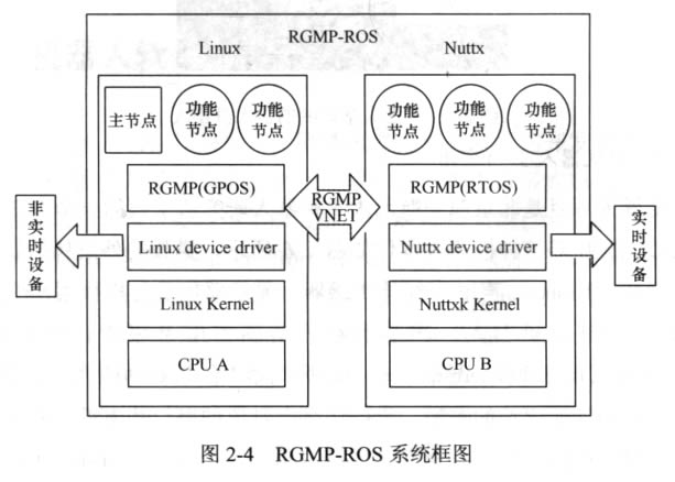 RGMP-ROS的系統(tǒng)框圖如圖2-4所示,整個機器人混合操作系統(tǒng)由兩個部分組 成:一個是安裝在Linux 上的標準ROS 系統(tǒng),另一個是運行在實時操作系統(tǒng)Nuttx 上的實時ROS 系統(tǒng)。我們將運行在Linux 上的ROS 功能節(jié)點稱為非實時ROS 節(jié)點, 運行在實時系統(tǒng)上的ROS 節(jié)點稱為ROS 實時節(jié)點,它們運行在各自的操作系統(tǒng)之 上。實時與非實時節(jié)點之間通過RGMP 提供的VNET 管道進行通信。實時ROS 節(jié) 點運行在Nuttx 之上,能夠通過標準的ROS 通信協(xié)議實現(xiàn)實時節(jié)點與實時節(jié)點、實 時節(jié)點與非實時節(jié)點之間的通信,并且傳遞符合ROS 協(xié)議規(guī)范的消息。實時節(jié)點 通過Nuttx 驅(qū)動與Nuttx 系統(tǒng)內(nèi)核和實時系統(tǒng)掛載的外部設備進行交互,以達到控 制實時設備的目的。為了保證實時性,GPOS 與 RTOS 各自擁有d立的外設。