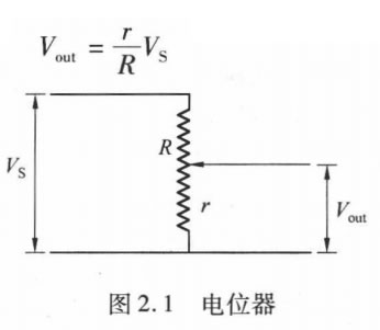 電位器是Z簡單的位置傳感器,如圖2.1所示。電位器通 過電阻把位置信息轉(zhuǎn)化為隨位置變化的電壓,通過檢測輸出電 壓的變化確定以電阻中心為基準位置的移動距離。當電阻器 上的滑動觸頭隨位置變化在電阻器上滑動時,觸頭接觸點變化 前后的電阻阻值與總阻值之比就會發(fā)生變化。在功能上,電位 器充當了分壓器的作用,因此輸出電壓Vout 與可變電阻r 成 比 例,即