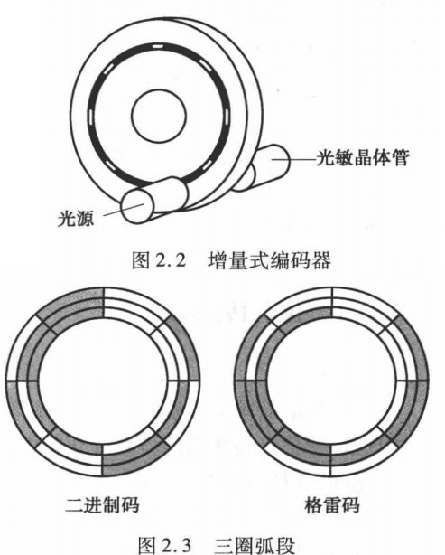 (2)絕對式光電編碼器。絕對式光電編碼器碼盤的每個位置都對應(yīng)著透光與不透光弧段 的W一確定組合,這種確定組合有W一的特征。通過這W一的特征,不需要已知起始位置,在 任意時刻就可以確定碼盤的準確位置。在起始時刻,控制器通過判斷碼盤所在位置的W一信 號特征,能夠確定機器人所在的位置。